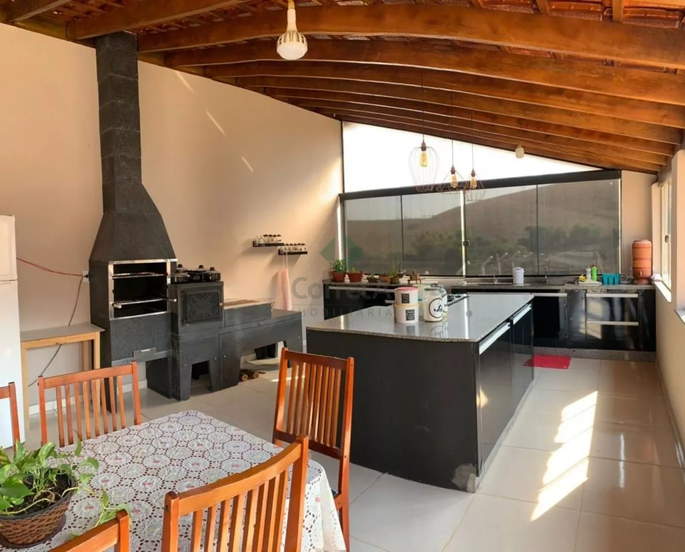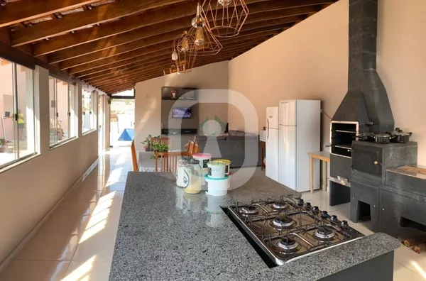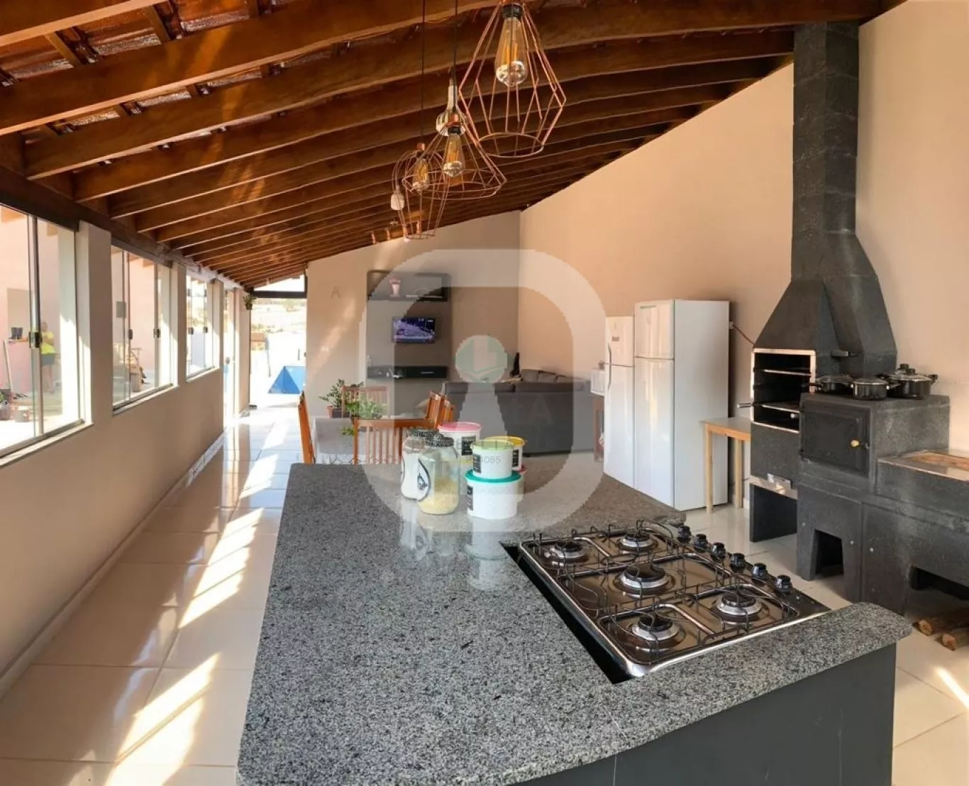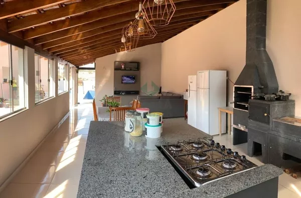 Área externa já pronta, com fogão a lenha, ilha, churrasqueira, pia 2 cubas, televisão, sofá, banheiro com box.