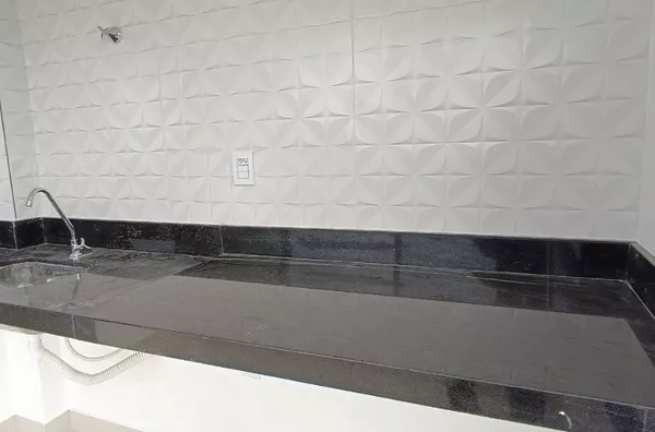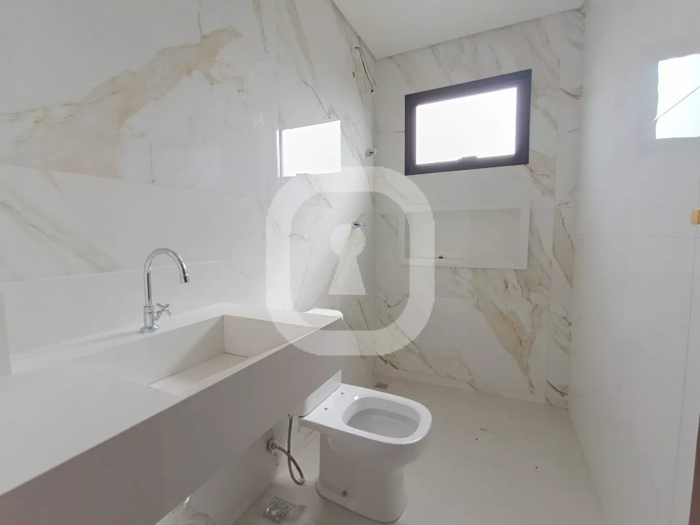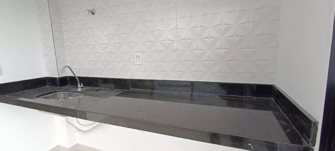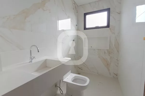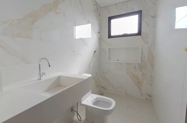 - Banheiro social moderno com pia de porcelanato esculpido;