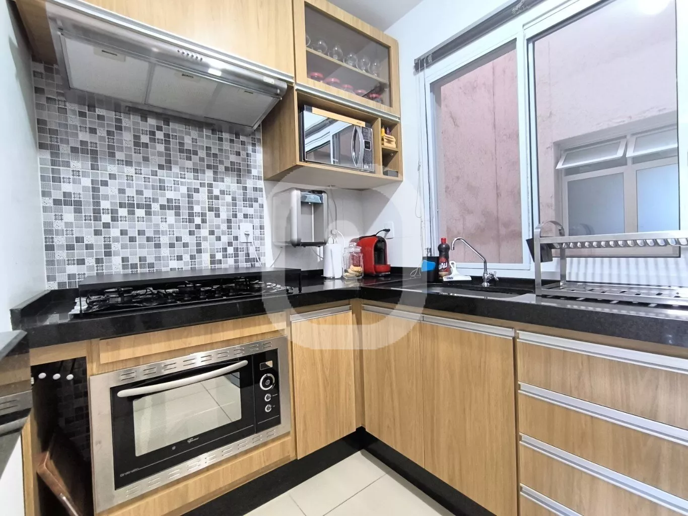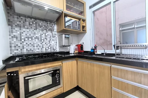 - Cozinha planejada com balcão e bancada em granito, equipada com fogão/forno e depurador de ar.