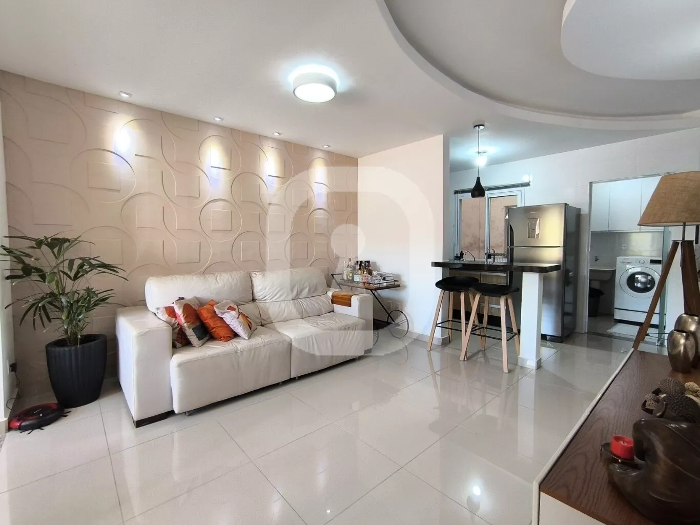 - Detalhes de acabamento como rebaixamento de teto, revestimento em 3D na sala de TV, spots iluminação e pisos laminado e porcelanato