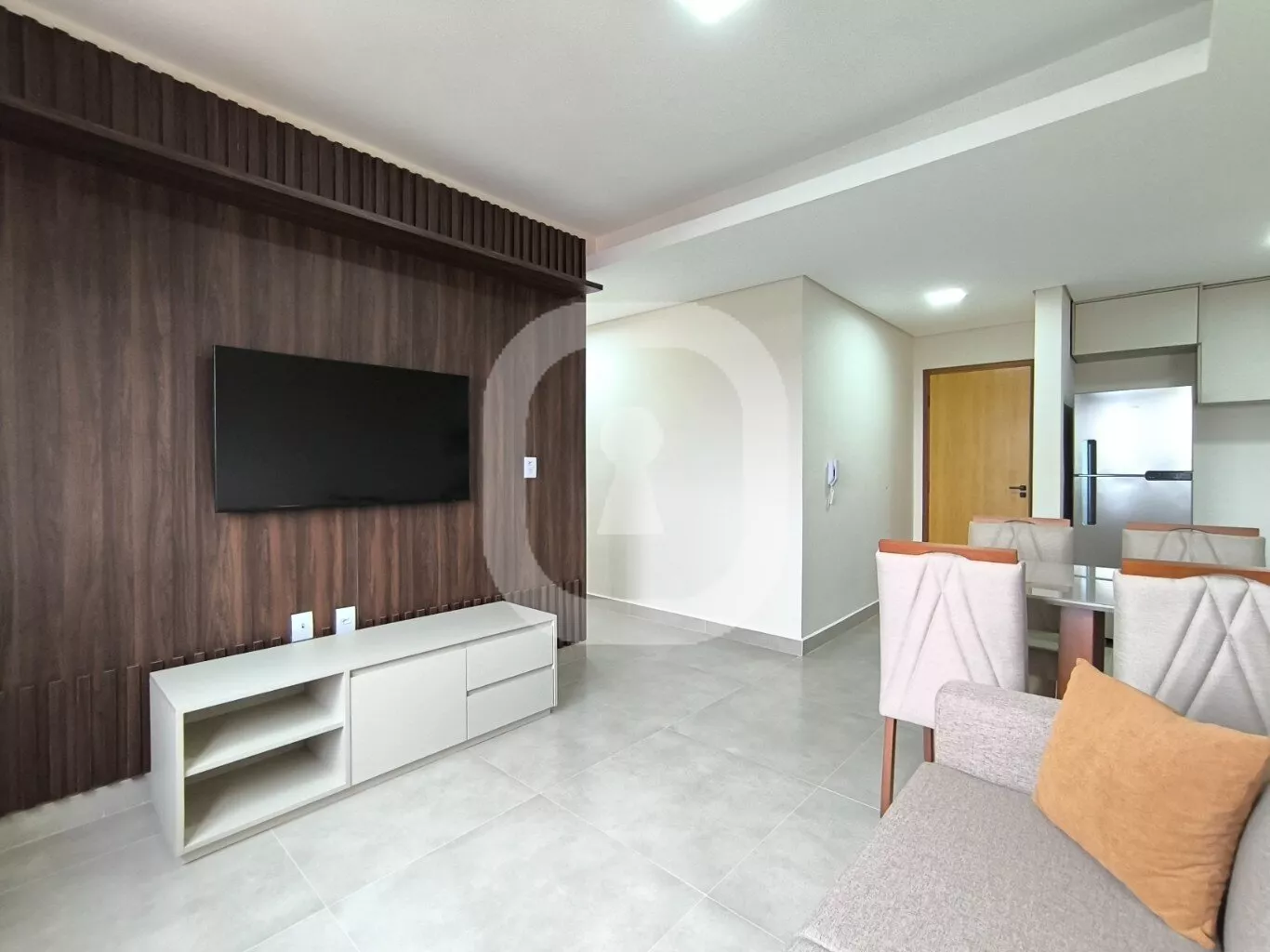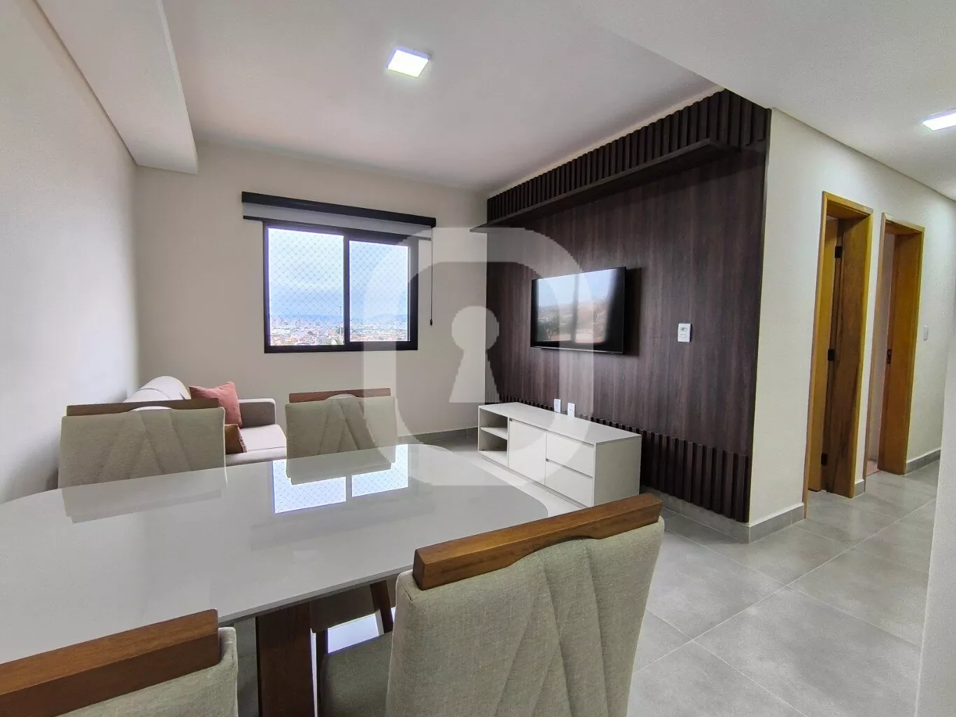 - Ampla sala de estar e jantar, equipada com painel, TV e mesa de jantar para 4 cadeiras